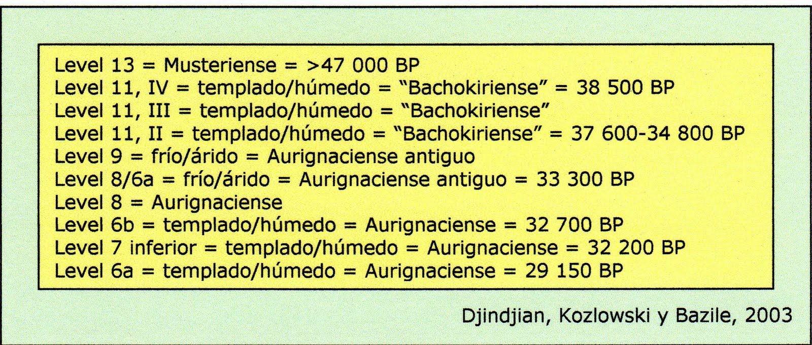 - Las diferencias del nivel Musteriense (12) y del Bachokiriense (11) son de tal calibre que fue calificado por los autores de la excavación como de hiatus arqueológico. Tal diferencia corresponde con lo que se ha denominado como nichos cognitivos diferentes, indicando la diferencia de desarrollo cognitivo que existía entre las poblaciones que generaron estos estratos arqueológicos. Estas diferencias las podemos ver resumidas en el siguiente cuadro: